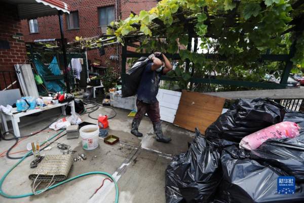 9月3日,在美国纽约昆斯区,工人清理一座房屋地下室中被损毁的物品。