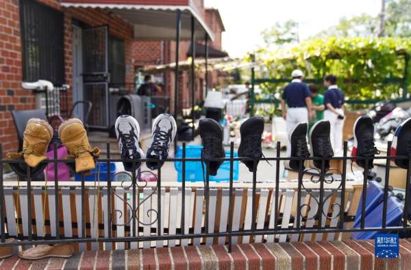 9月3日,在美国纽约昆斯区,一户居民在街边晾晒被浸泡的鞋子。