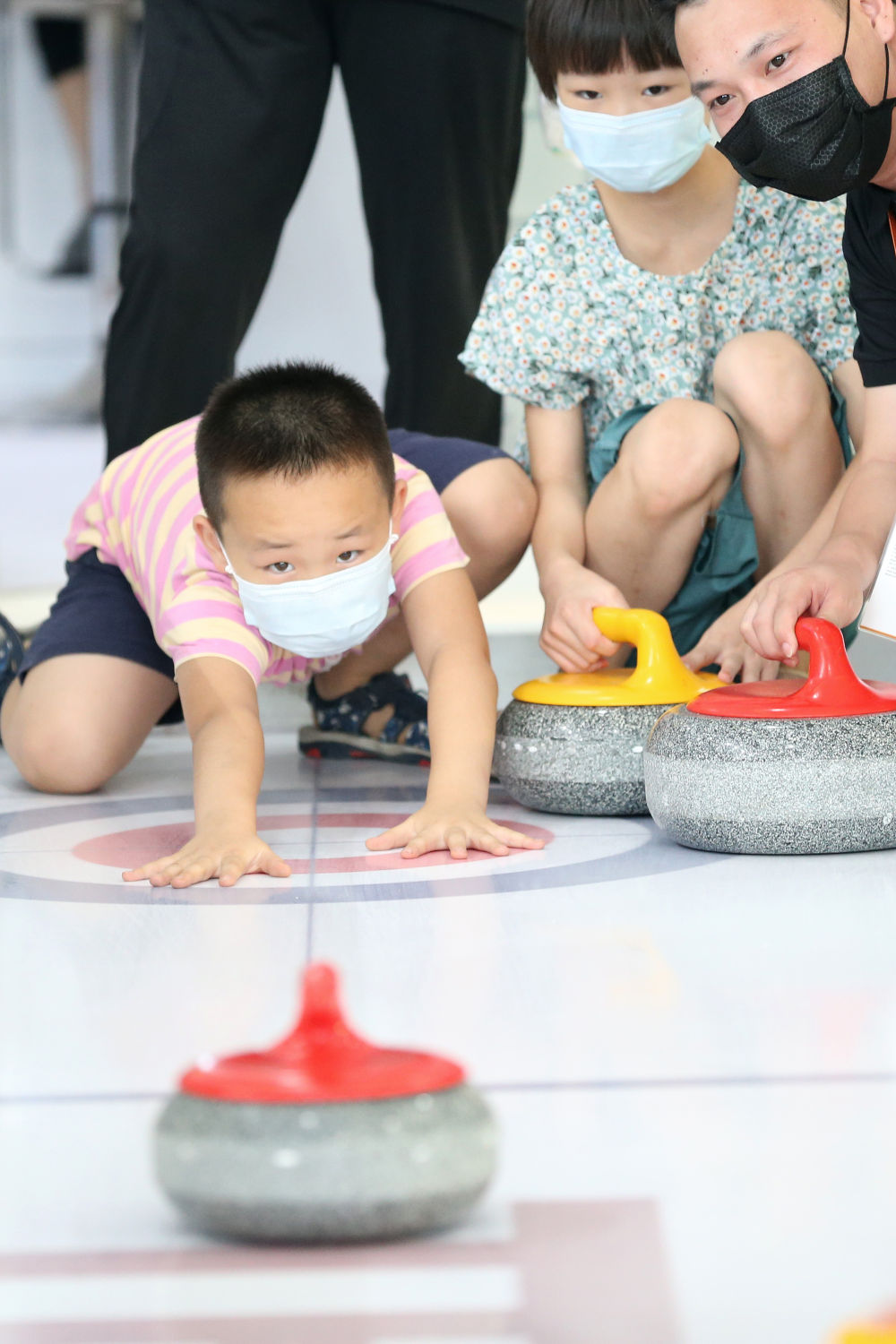资料图:2020年9月5日,一名儿童在冬季运动专题展区体验掷冰壶。新华社记者 李明 摄