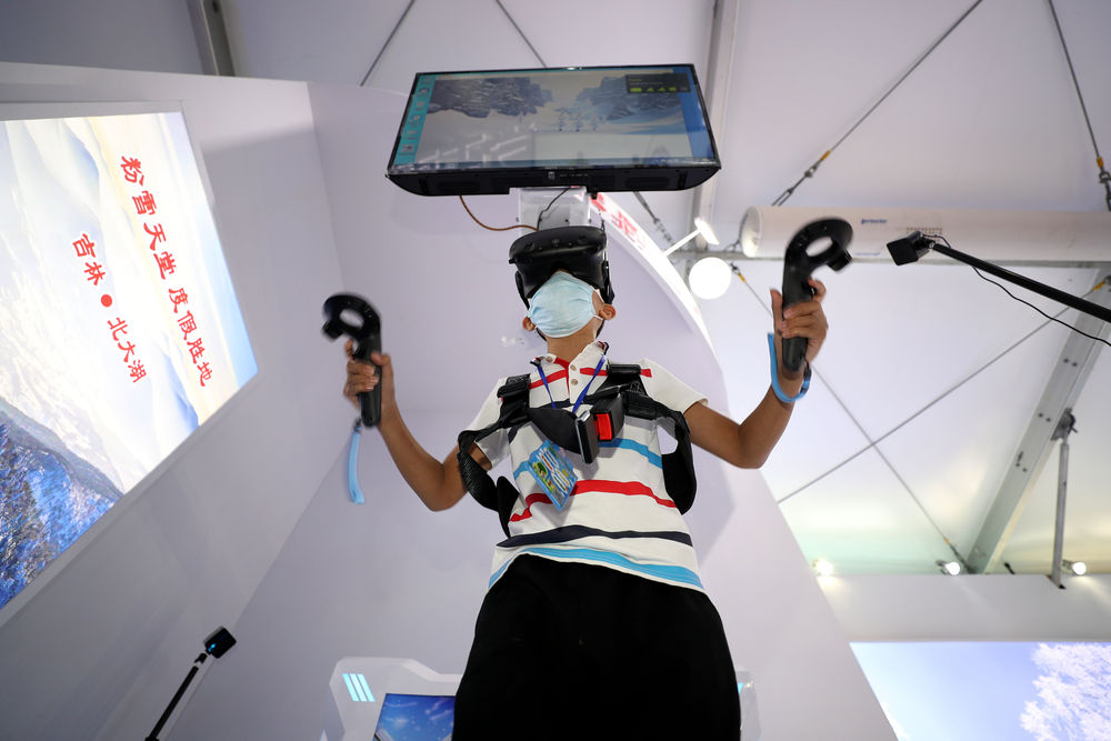 资料图:2020年9月5日,一名儿童在冬季运动专题展区通过VR技术体验滑雪。新华社记者 李明 摄